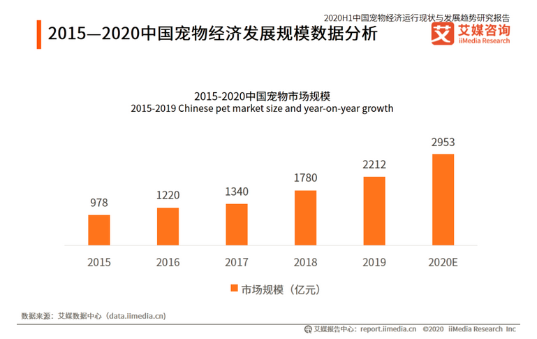 iiMedia Research(艾媒咨询)数据显示,中国宠物市场规模在2019年达到2212亿元,预计2020年将达2953亿元。2015-2019五年内市场规模翻了2倍,年复合增长率20%。随着宠物饲养观念的广泛普及和宠物行业延伸服务的挖掘,中国宠物经济的市场空间将进一步扩大。