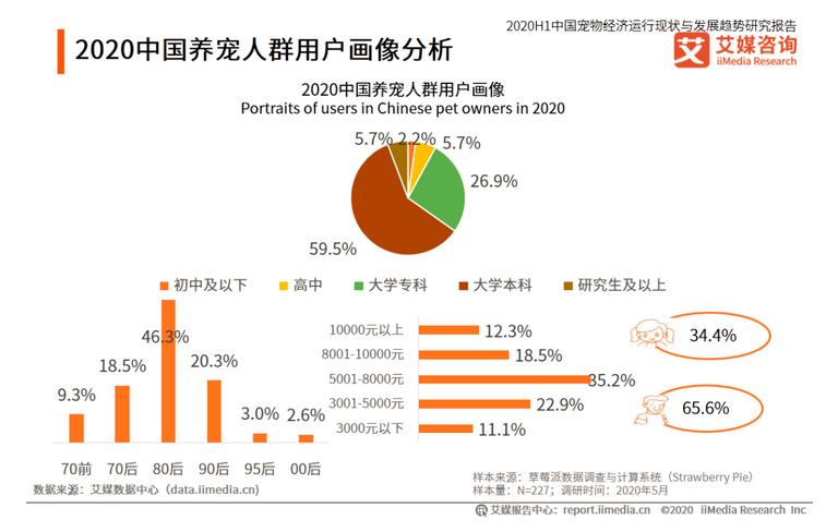 从用户画像来看,养宠人群呈现年轻化特征,80后、90后人群占比分别达到了46.3%、20.3%。中国城镇养宠人群收入较高,月收入在8000元以上占比约三分之一。且养宠人群呈现高学历特征,教育程度在本科、研究生及以上的养宠人群占比分别为59.5%和5.7%。