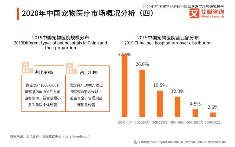 宠物医疗方面,从固定资产看,有90%宠物医院的固定资产少于1000万元,面积约200-300平方米。而从营业额看,有80.9%的宠物医院年营业额在300万元以下。目前中国的中国宠物医院以中小规模仍以中小型个体企业为主,市场集中度有待提升。