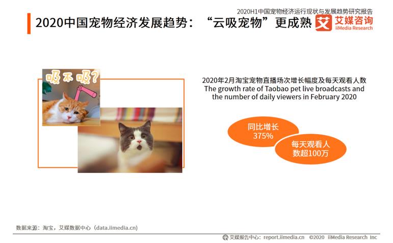 除此之外,疫情期间云经济快速发展,“云吸宠物”模式更加成熟,也从以往看图说话、视频逗趣的形态升级为24小时超长直播、隔屏互动,充分体验“云养宠物”。2020年2月份,淘宝宠物直播场次同比增长375%,每天观看人数超100万。