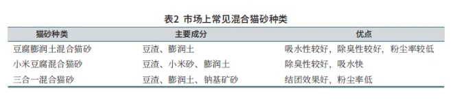 近年来市场上出现一些混合猫砂(表2),比较常见的混合猫砂主要是将膨润土猫砂和豆腐猫砂混合。豆腐猫砂原料安全,吸水性较好,抑菌除臭性较好,膨润土猫砂价格低廉,抑菌除臭性较差。可综合豆腐猫砂和膨润土猫砂各自的优缺点,在此基础上通过试验,筛选相对合适的配比工艺,研制功效性更好的猫砂。王诚等通过研究得出当豆腐猫砂与膨润土猫砂的混合比例为7︰3时,在吸水性、结团性、粉尘率和除臭性能上有良好的表现。
