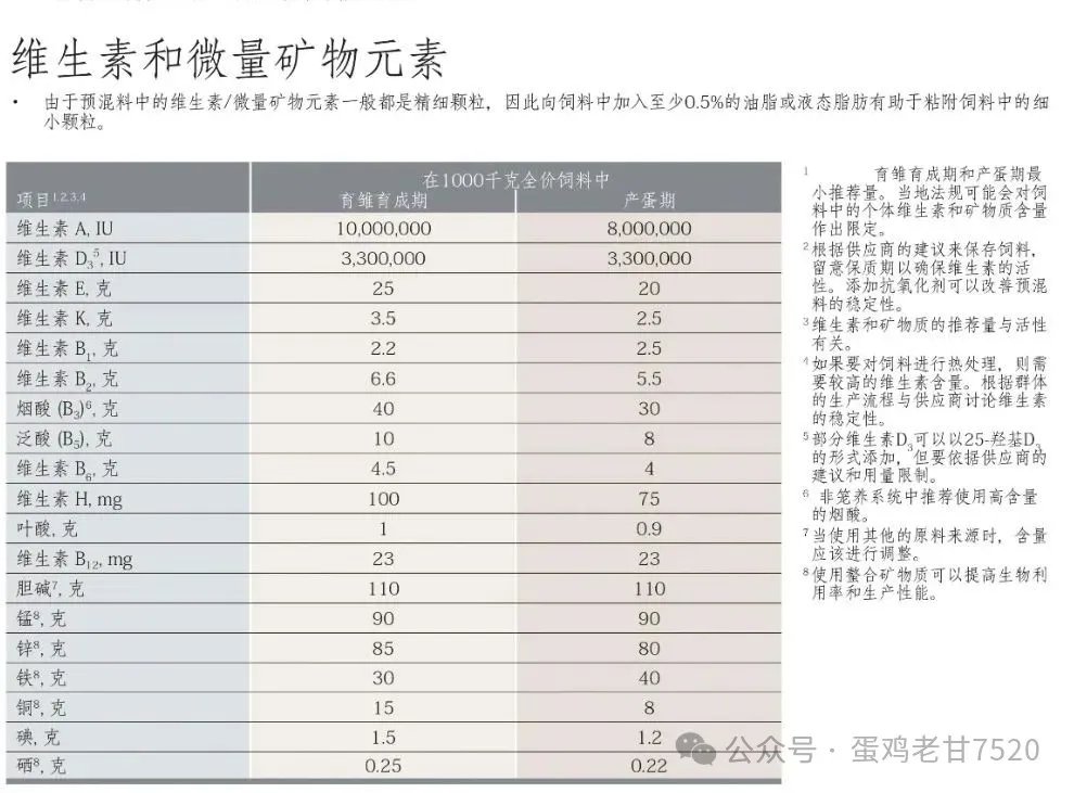 关于蛋鸡(产蛋家禽)的维生素需要量。以NRC标准说明,NRC的《家禽营养需要》是蛋鸡营养领域的权威标准之一,NRC提供的是最低需要量(防止缺乏症出现)。供给量是在实际生产中,为了实现最佳的生产性能、蛋品质量和动物健康, 远高于NRC标准的“推荐量”或“最适量”。