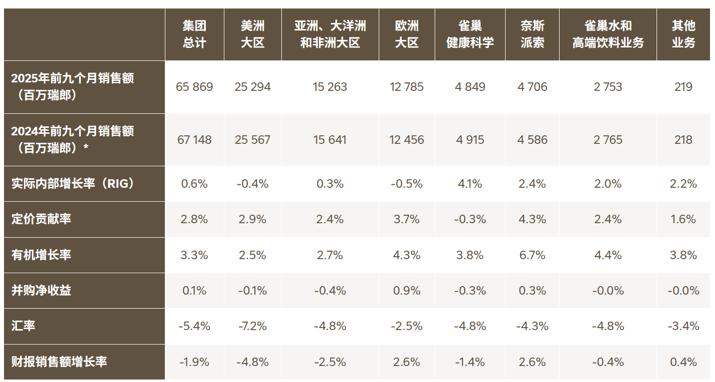 根据财报显示,雀巢集团第三季度的净销售额报告为216.4亿瑞士法郎(约合272亿美元),低于2024年第三季度的221亿瑞士法郎(约合277.8亿美元)。实际内部增长率为1.5%,定价贡献率为2.8%,有机增长率为4.3%。