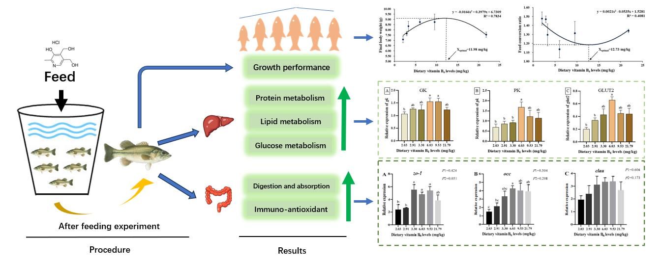维生素B6是一种水溶性维生素,在生物的生长发育过程中起着重要作用,由于鱼类不能合成或者合成的量不足以满足自身需要,故需从外界摄取。因此,定量鱼类对饲料中维生素B6的需求量是推进鱼类健康养殖的重要一步。基于此,团队开展了大口黑鲈对饲料维生素B6的营养需求研究,并探讨了饲料维生素B6水平在调节大口黑鲈肝脏代谢能力和肠道关键功能中的作用。根据实验结果,得出结论如下:饲料中适宜水平的维生素B6能显著提高大口黑鲈的生长性能和饲料利用率,并改善鱼体成分和形体指标。根据FBW和FCR的二次回归分析结果,大口黑鲈幼鱼对饲料中维生素B6的需求量分别为11.98 mg/kg和12.73 mg/kg;饲料中 6.03 mg/kg和 9.53 mg/kg的维生素B6能够通过上调大口黑鲈肝脏中与蛋白质和糖脂代谢相关的基因的表达,并提高相关酶的活性,增强肝脏代谢能力;饲料中 6.03 mg/kg和9.53 mg/kg的维生素B6通过增强消化酶活性和抗氧化防御系统以及调控Keap1/Nrf2-ARE信号通路和NF-κB信号通路等,显著增强大口黑鲈肠道的消化能力和免疫抗氧化能力。