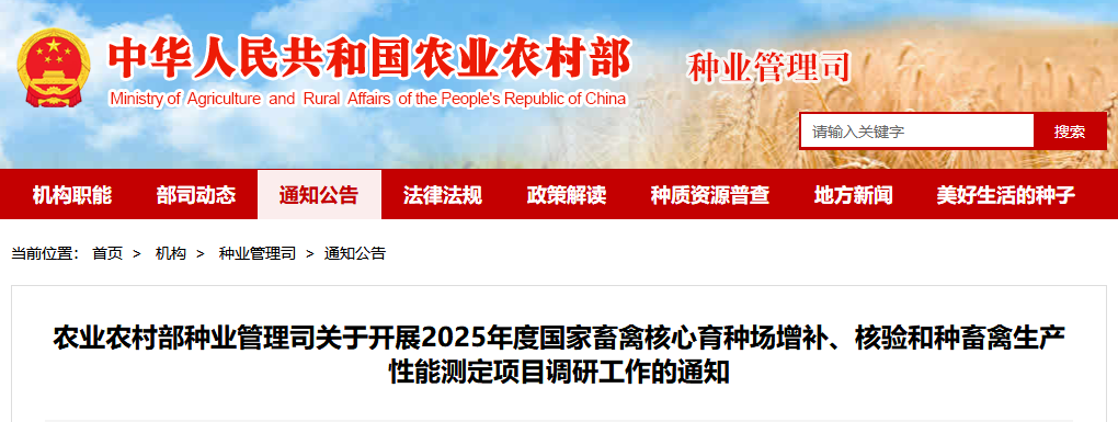 为贯彻落实中央种业振兴行动部署,按照《农业农村部关于印发新一轮全国畜禽遗传改良计划的通知》(农种发〔2021〕2号)要求,今年种业管理司会同全国畜牧总站组织新增补一批国家畜禽核心育种场、良种扩繁推广场和国家核心种公畜站,并对有效期满5年及经营主体或场址变更的单位开展核验。同时为全面了解种畜禽生产性能测定项目实施情况,进一步优化项目管理,提高财政资金使用效益,同步开展项目实施情况专题调研工作,现将有关事项通知如下。